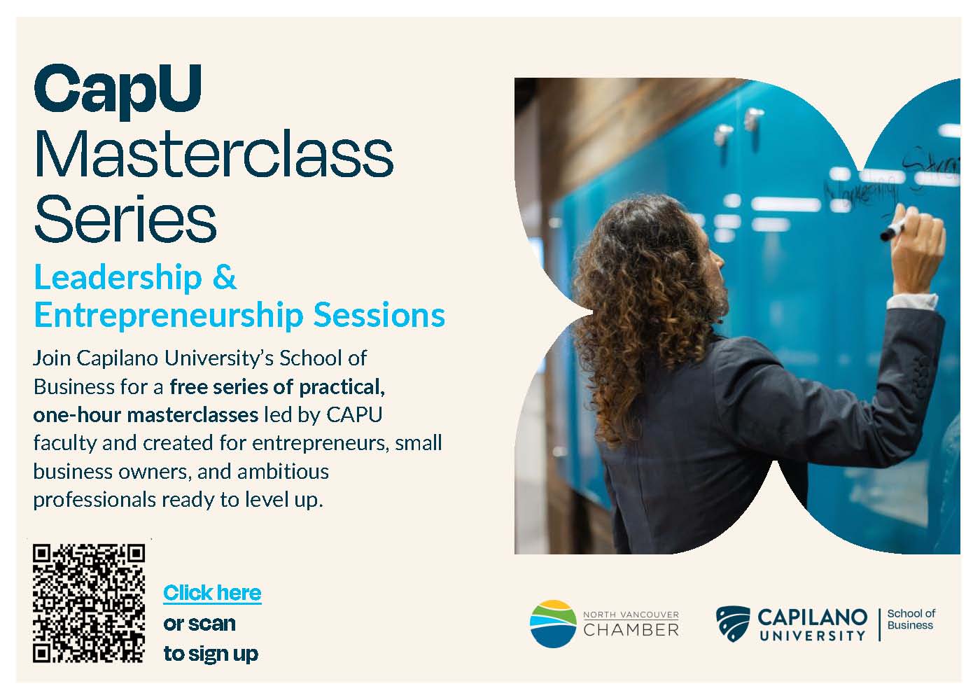 We’re excited to invite you this May and June to join a free series of practical, one-hour masterclasses led by CapU School of Business faculty. These sessions are designed for entrepreneurs, small business owners, and professionals looking to build skills, explore new ideas, and stay competitive in a rapidly changing environment.