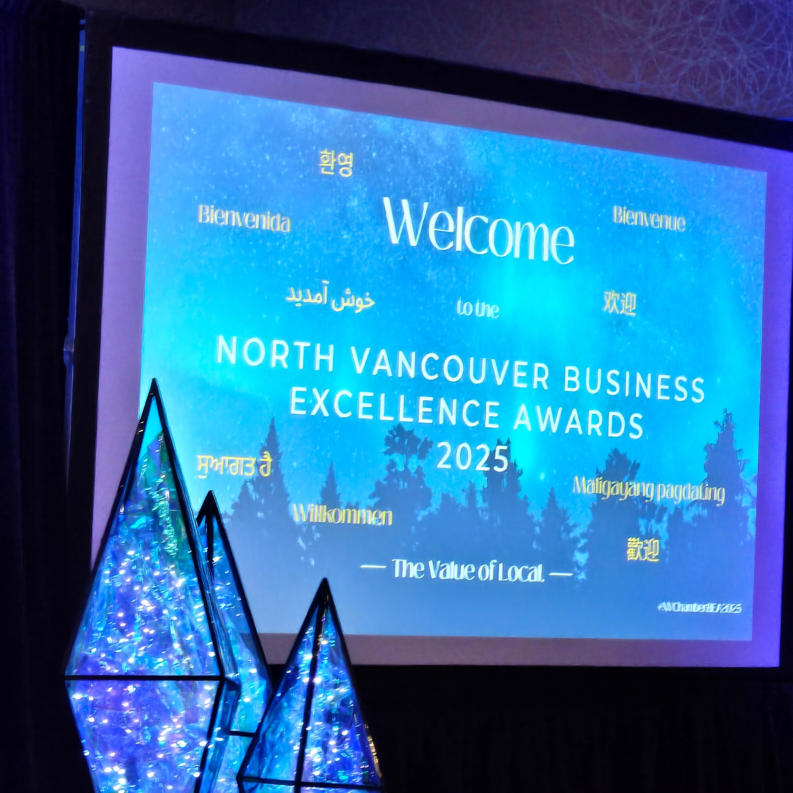 The North Vancouver Chamber’s annual Business Excellence Awards, held on November 19, was a tremendous success, bringing together a sold-out crowd for an evening that truly celebrated the strength and spirit of our local business community. Business leaders, entrepreneurs, and community members gathered at the Pinnacle Hotel at the Pier, where the ballroom glowed in the colours of the Northern Lights—an inspiring backdrop to this year’s theme, The Value of Local.